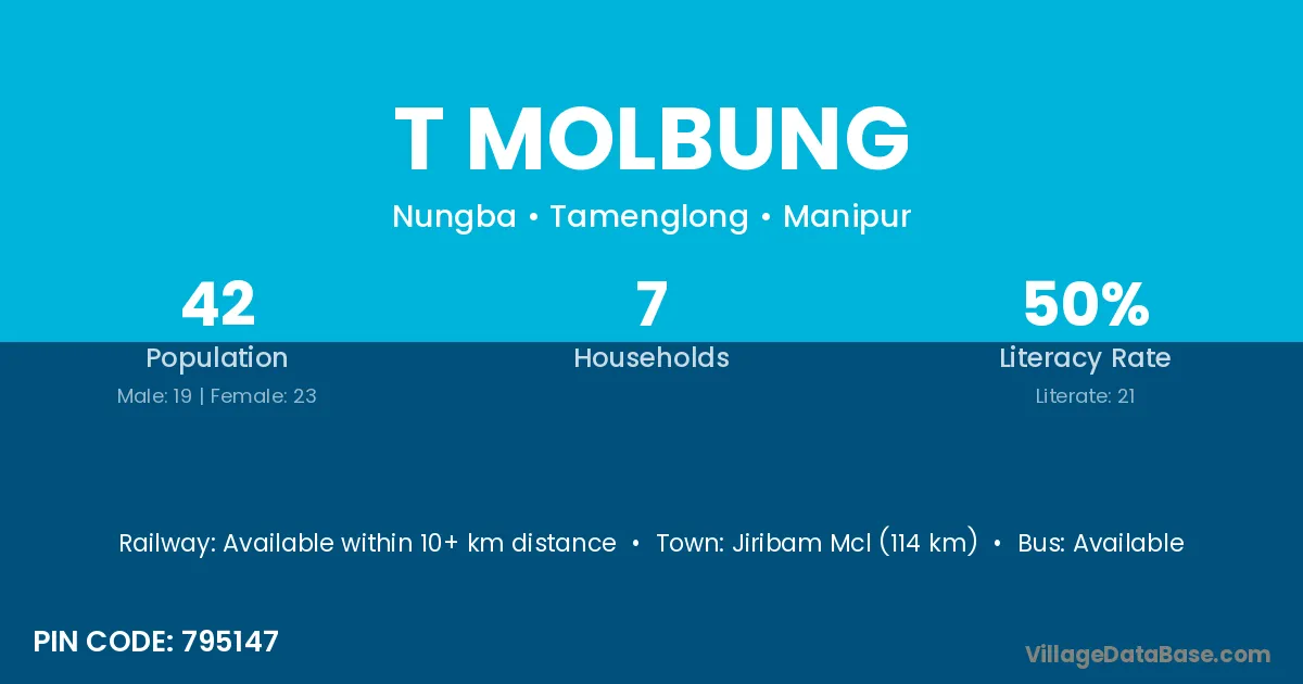 Jiribam Mcl (114 km) is the nearest town to T Molbung village for major economic activities and is located approximately 114 km away.