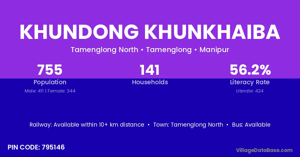 Khundong Khunkhaiba village has a total population of 755 people, of which 411 are males and 344 are females.
