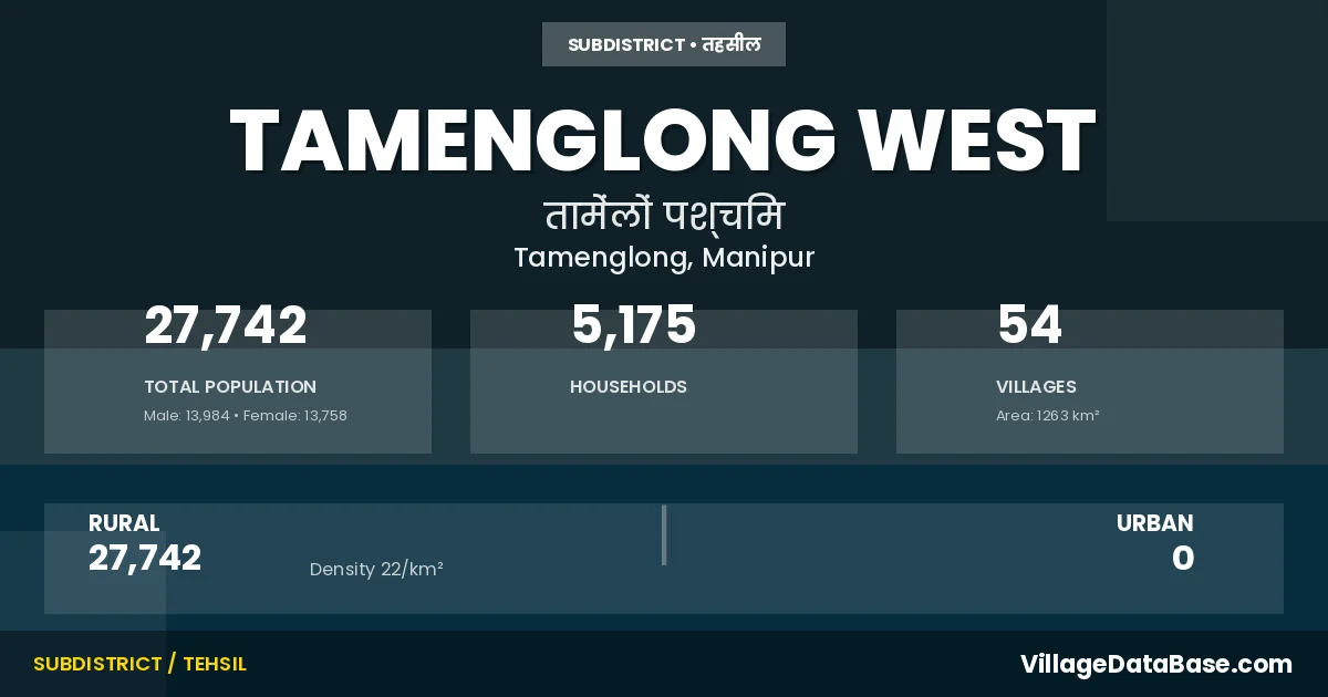 According to the 2011 census The total area of Tamenglong West Subdivision is 1263 km², with a population of 27742 people. The population density is 22 inhabitants per square kilometre, and there are approximately 5175 houses in the sub district.