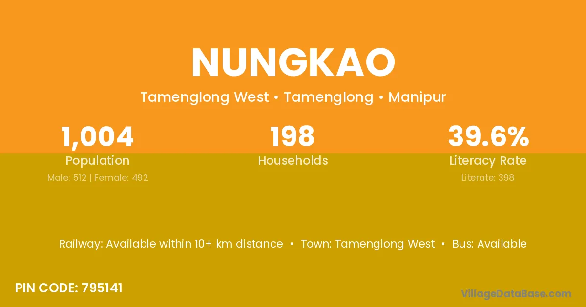 Nungkao village has a total population of 1,004 people, of which 512 are males and 492 are females.