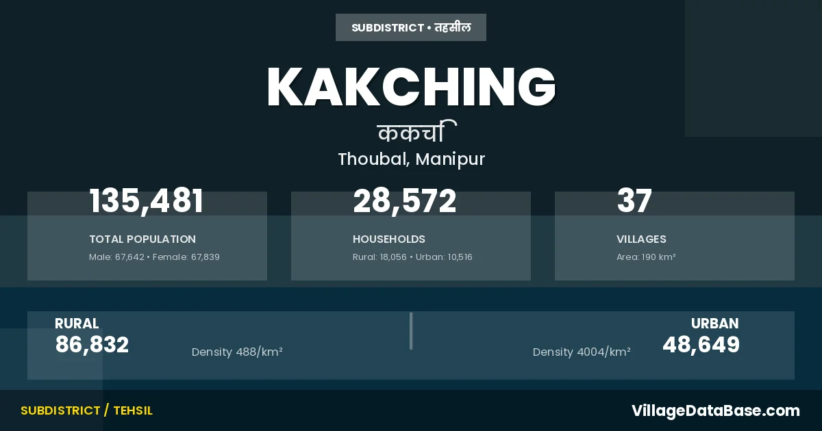 According to the 2011 census The total area of Kakching Subdivision is 190 km², with a population of 135481 people. The population density is 713 inhabitants per square kilometre, and there are approximately 28572 houses in the sub district.