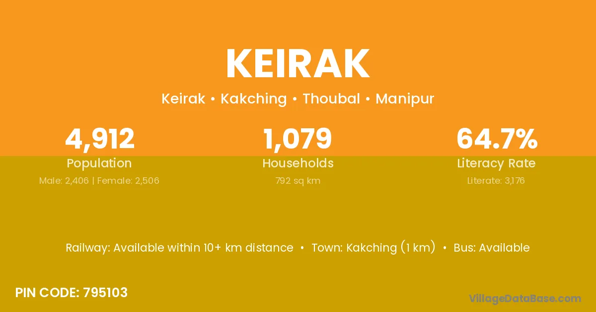 Kakching (1 km) is the nearest town to Keirak village for major economic activities and is located approximately 1 km away.