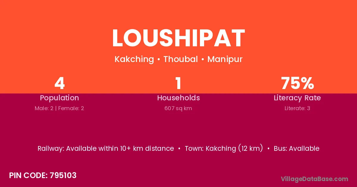 Kakching (12 km) is the nearest town to Loushipat village for major economic activities and is located approximately 12 km away.