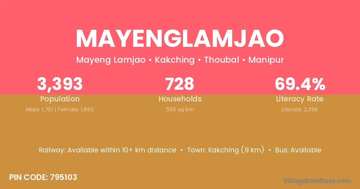 Kakching (9 km) is the nearest town to Mayenglamjao village for major economic activities and is located approximately 9 km away.