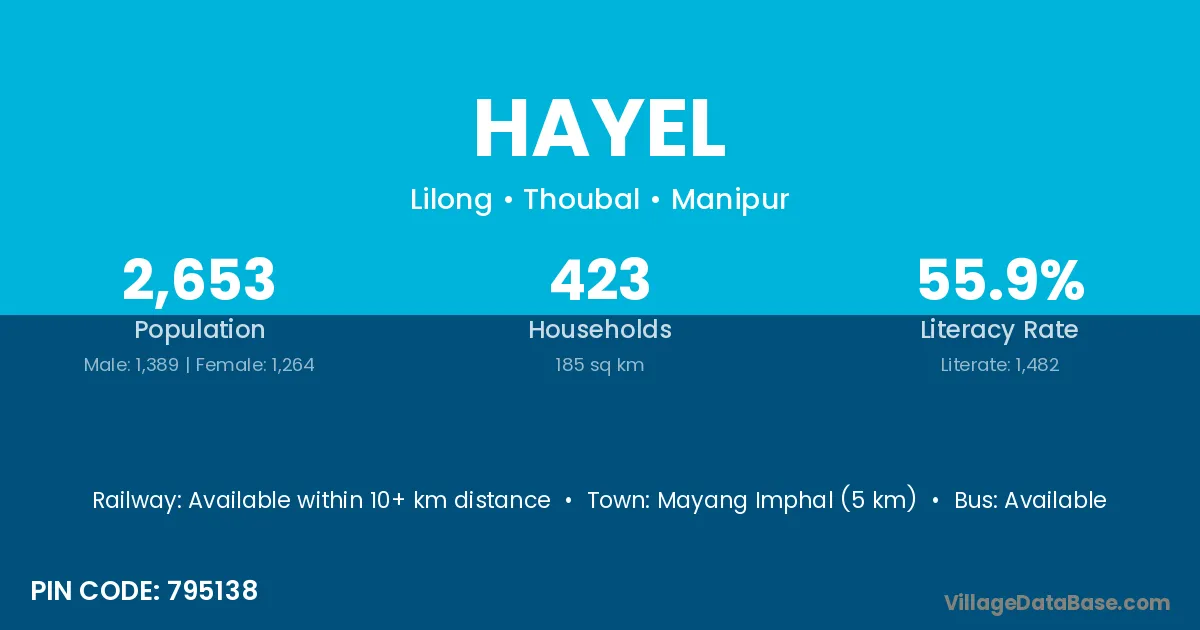 Mayang Imphal (5 km) is the nearest town to Hayel village for major economic activities and is located approximately 5 km away.