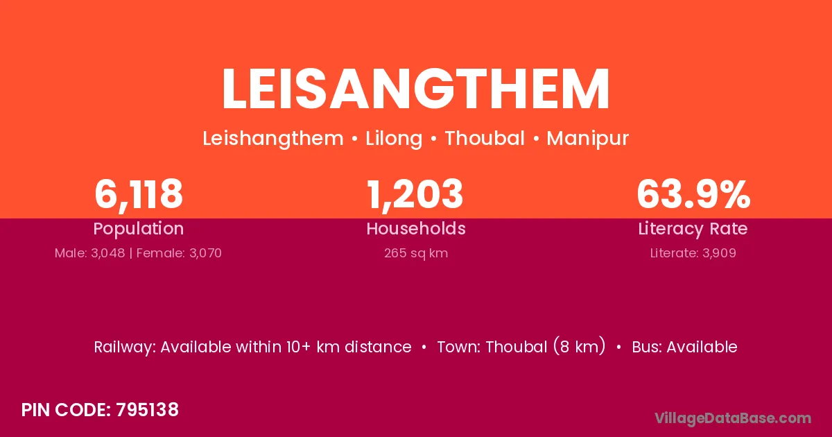 Thoubal (8 km) is the nearest town to Leisangthem village for major economic activities and is located approximately 8 km away.