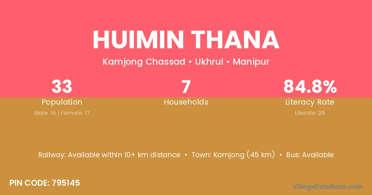 Kamjong (45 km) is the nearest town to Huimin Thana village for major economic activities and is located approximately 45 km away.