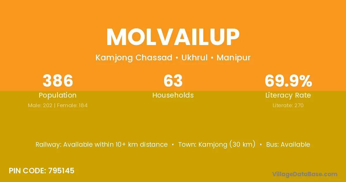 Kamjong (30 km) is the nearest town to Molvailup village for major economic activities and is located approximately 30 km away.
