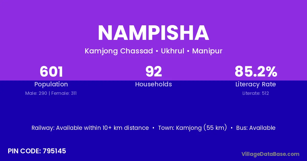 Kamjong (55 km) is the nearest town to Nampisha village for major economic activities and is located approximately 55 km away.