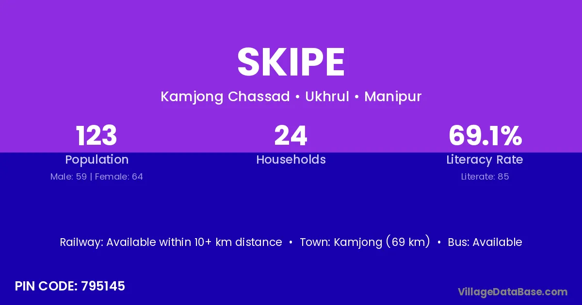 Kamjong (69 km) is the nearest town to Skipe village for major economic activities and is located approximately 69 km away.