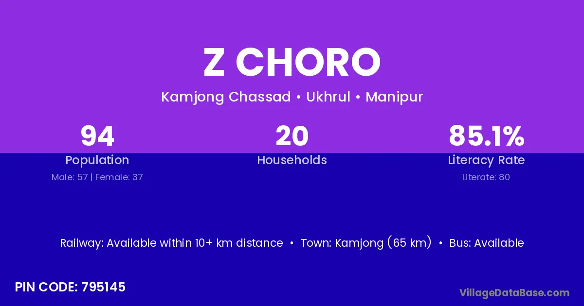 Kamjong (65 km) is the nearest town to Z Choro village for major economic activities and is located approximately 65 km away.