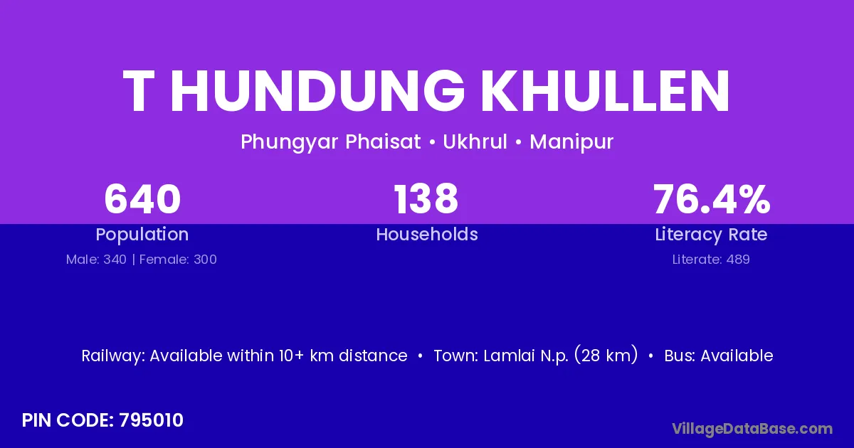 Lamlai N.p. (28 km) is the nearest town to T Hundung Khullen village for major economic activities and is located approximately 28 km away.