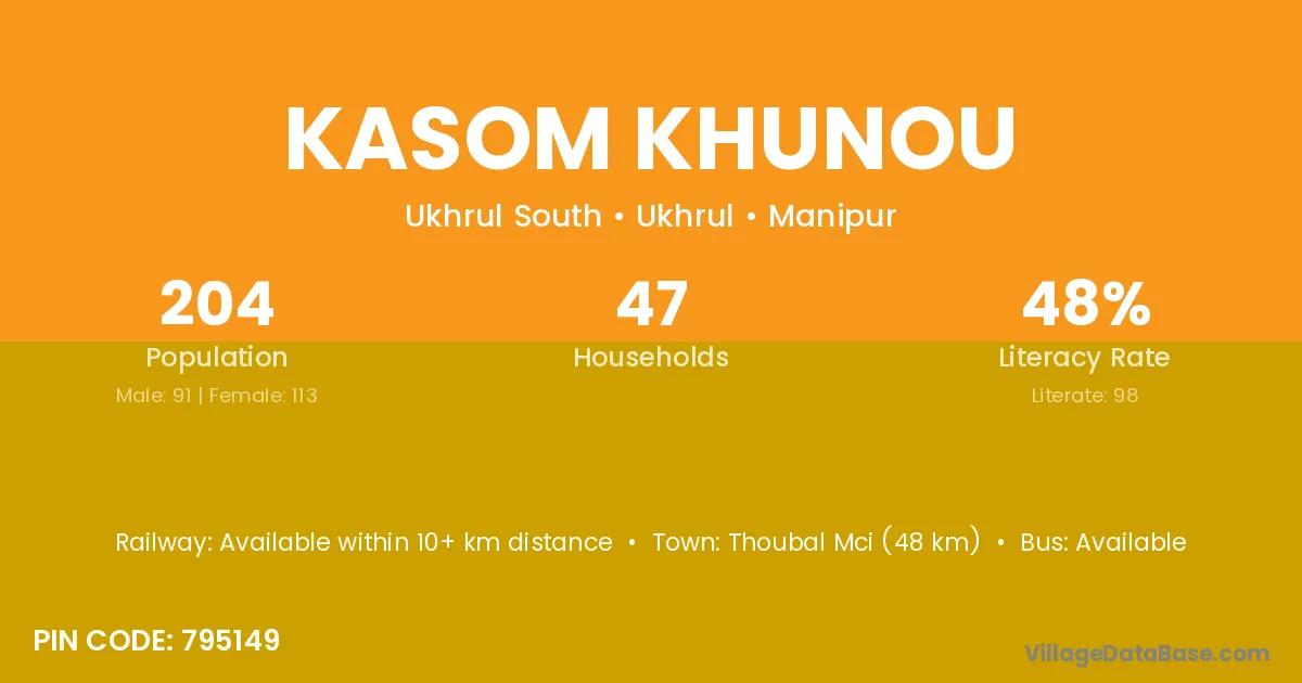 Thoubal Mci (48 km) is the nearest town to Kasom Khunou village for major economic activities and is located approximately 48 km away.