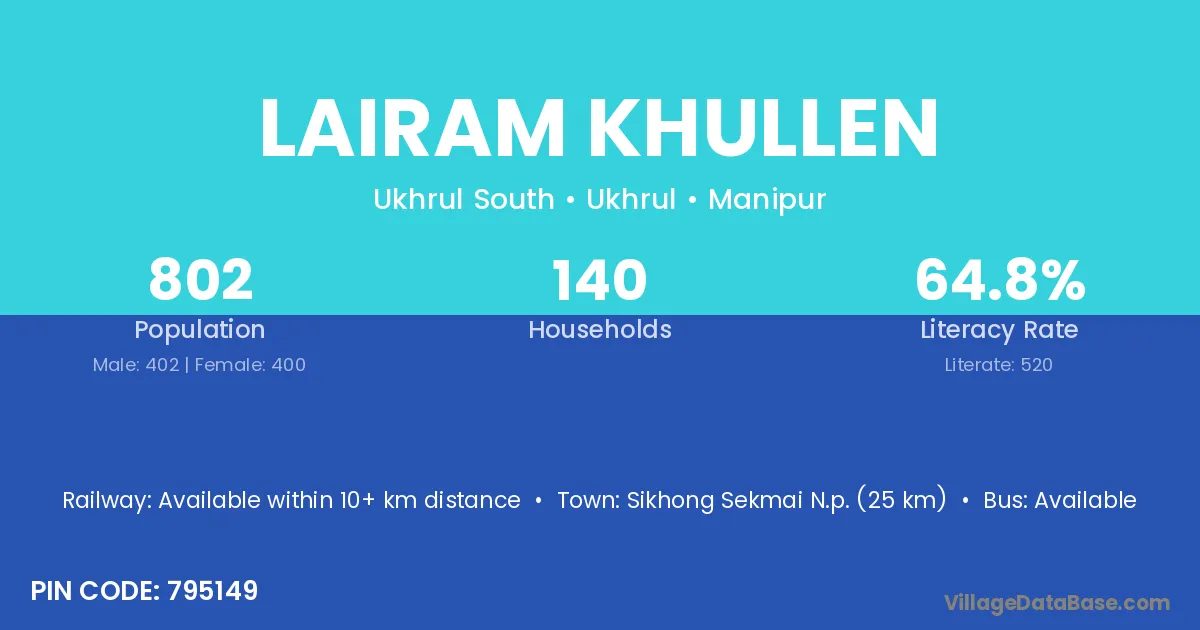 Lairam Khullen village has a total population of 802 people, of which 402 are males and 400 are females.