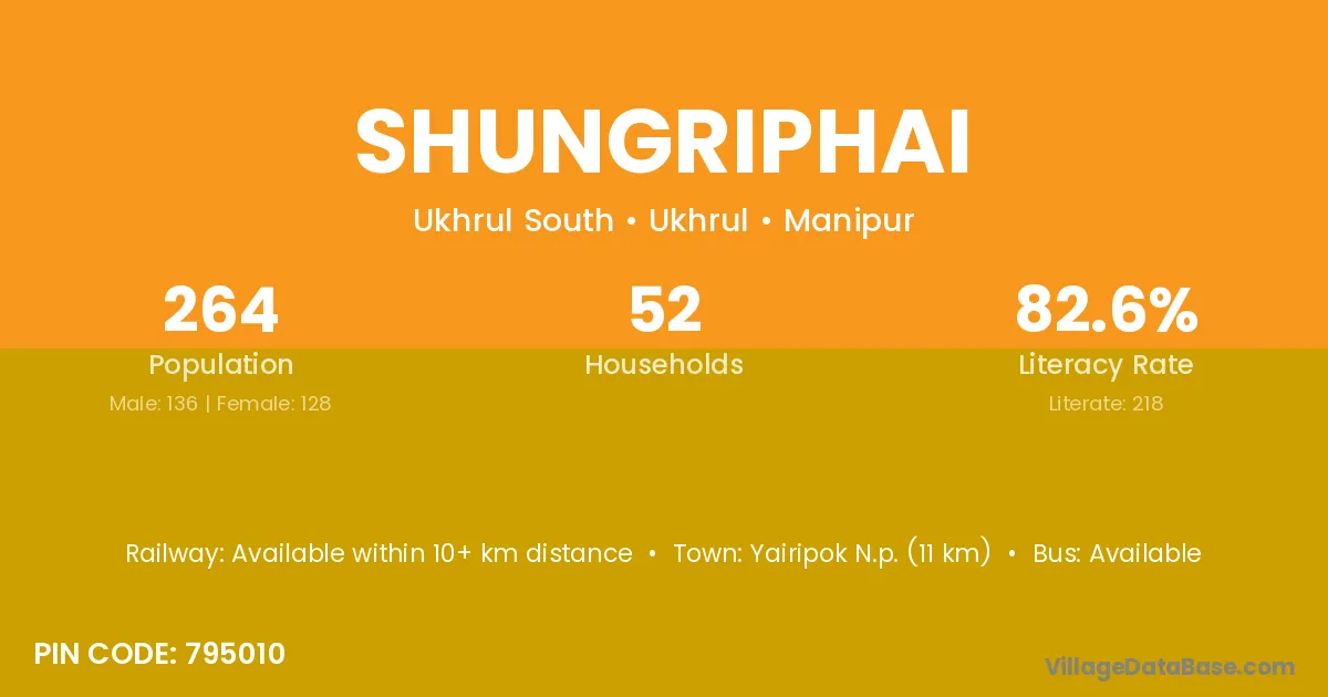 Yairipok N.p. (11 km) is the nearest town to Shungriphai village for major economic activities and is located approximately 11 km away.