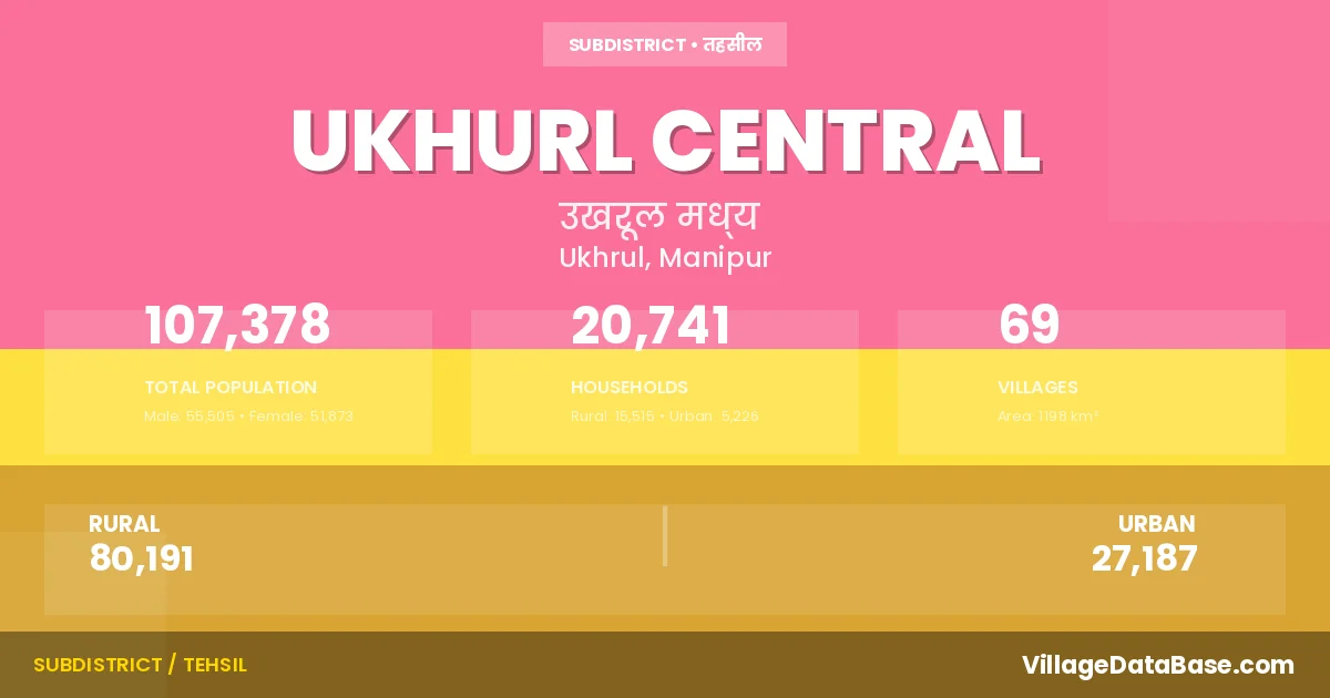 According to the 2011 census The total area of Ukhurl Central Subdivision is 1198 km², with a population of 107378 people. The population density is 90 inhabitants per square kilometre, and there are approximately 20741 houses in the sub district.
