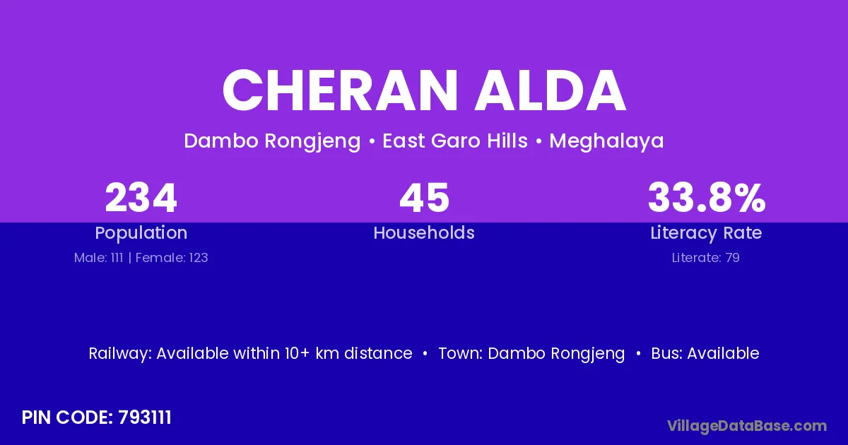 Cheran Alda village is located in the Dambo Rongjeng Subdivision of the East Garo Hills district in Meghalaya .