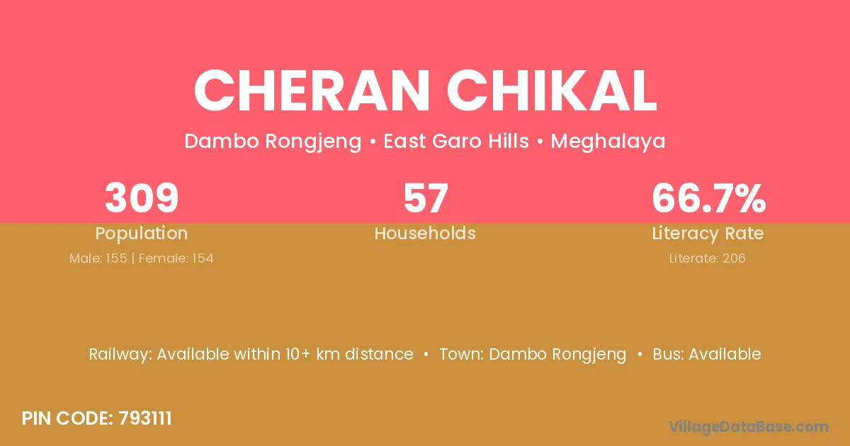 Cheran Chikal village has a total population of 309 people, of which 155 are males and 154 are females.