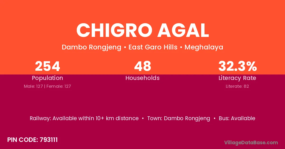 Chigro Agal village has a total population of 254 people, of which 127 are males and 127 are females.
