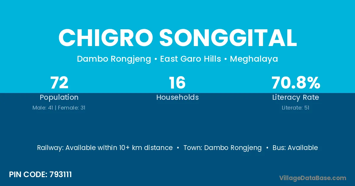 Chigro Songgital village has a total population of 72 people, of which 41 are males and 31 are females.