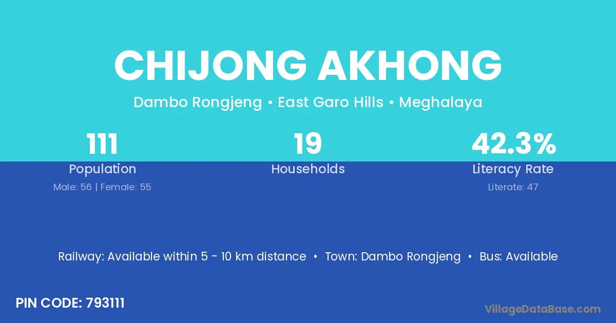 Chijong Akhong village has a total population of 111 people, of which 56 are males and 55 are females.