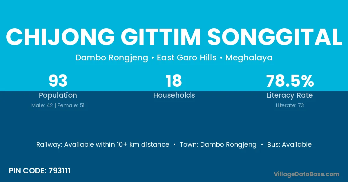 Chijong Gittim Songgital village has a total population of 93 people, of which 42 are males and 51 are females.