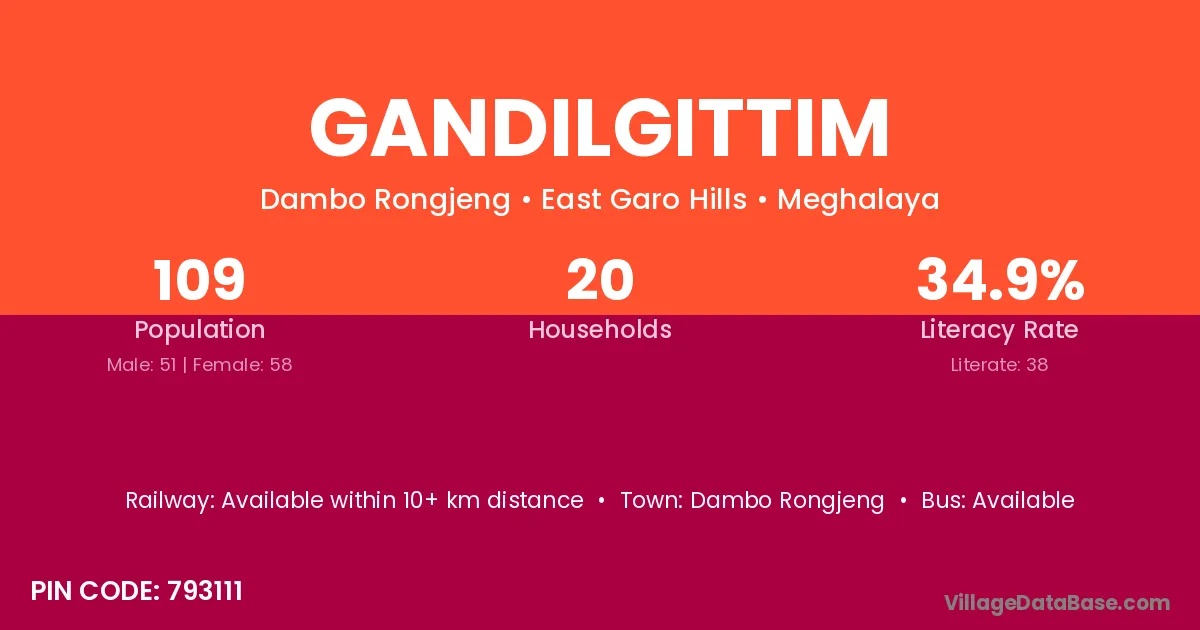 Gandilgittim village has a total population of 109 people, of which 51 are males and 58 are females.