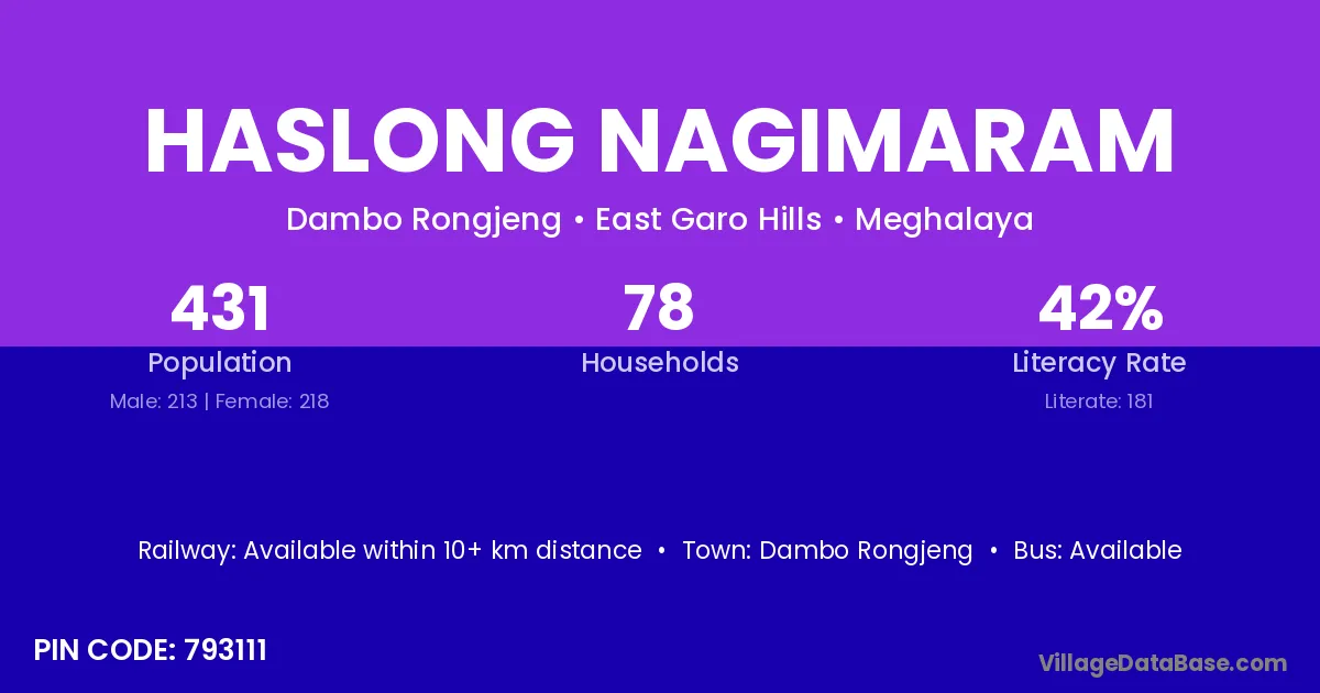 Haslong Nagimaram village has a total population of 431 people, of which 213 are males and 218 are females.