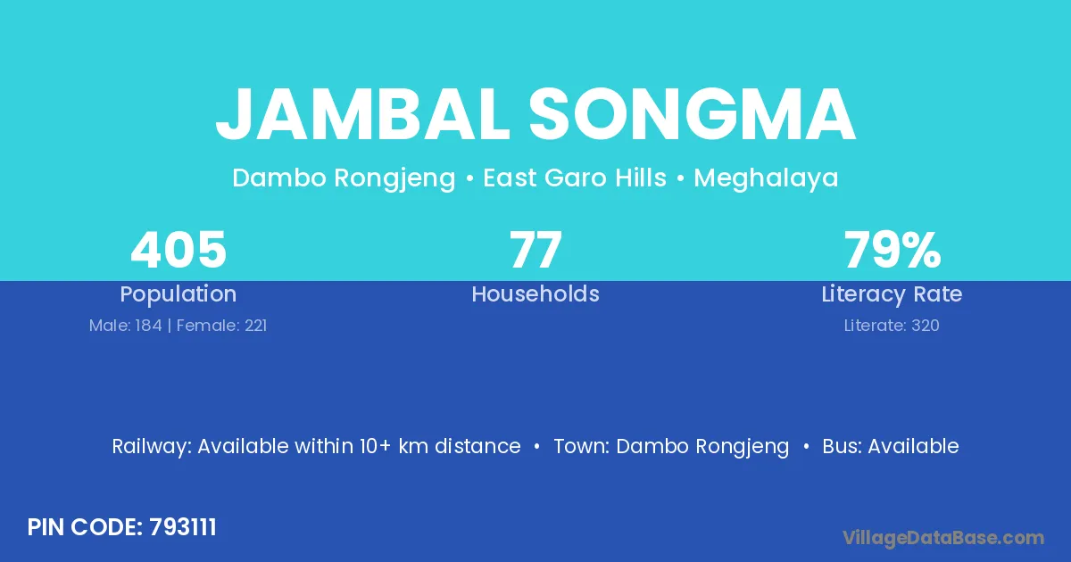 Jambal Songma village has a total population of 405 people, of which 184 are males and 221 are females.