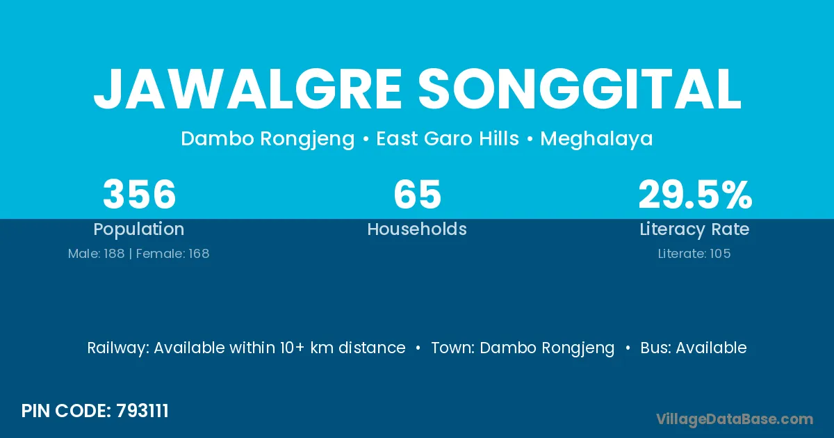 Jawalgre Songgital village has a total population of 356 people, of which 188 are males and 168 are females.