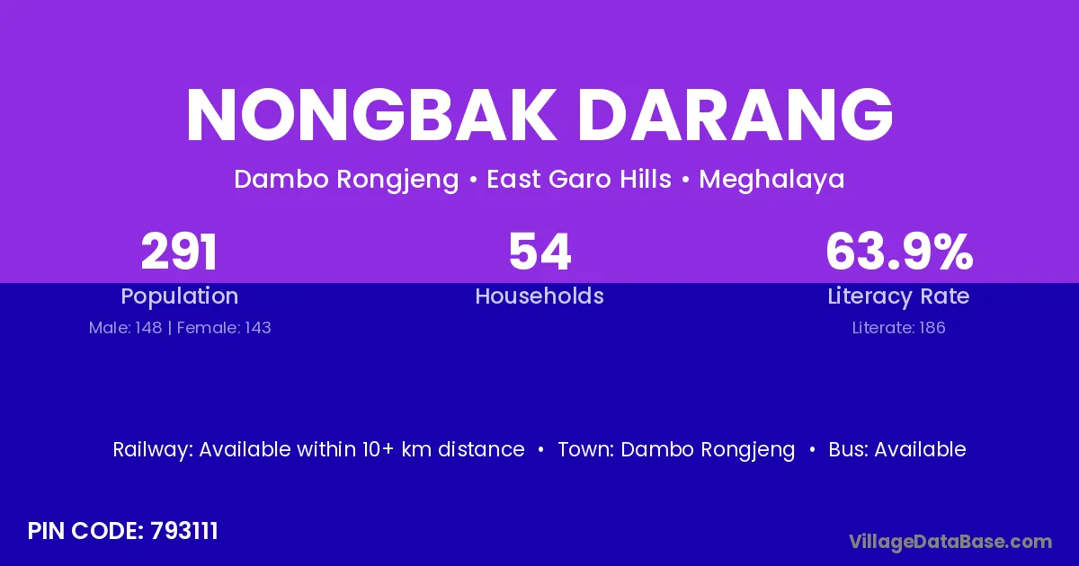 Nongbak Darang village has a total population of 291 people, of which 148 are males and 143 are females.