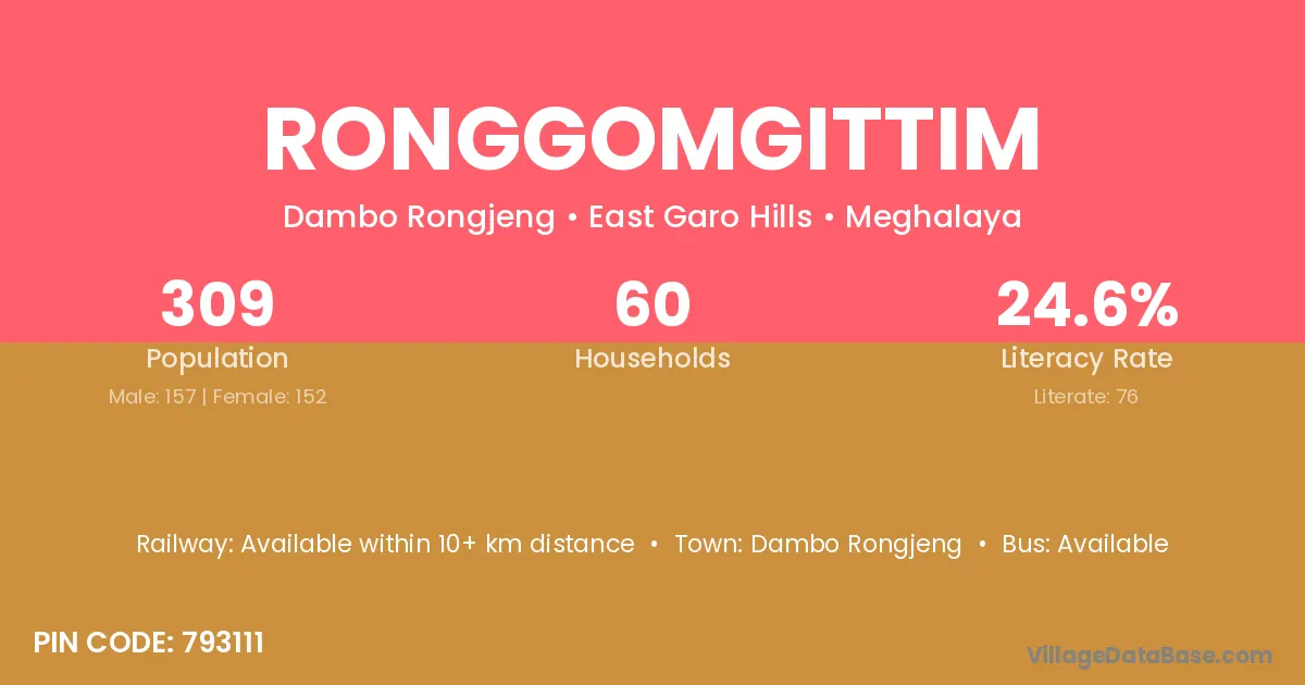 Ronggomgittim village has a total population of 309 people, of which 157 are males and 152 are females.