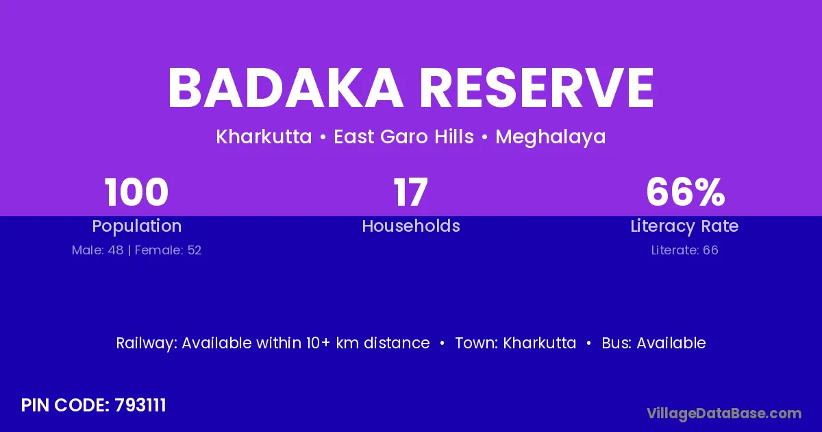 Badaka Reserve village is located in the Kharkutta Subdivision of the East Garo Hills district in Meghalaya .