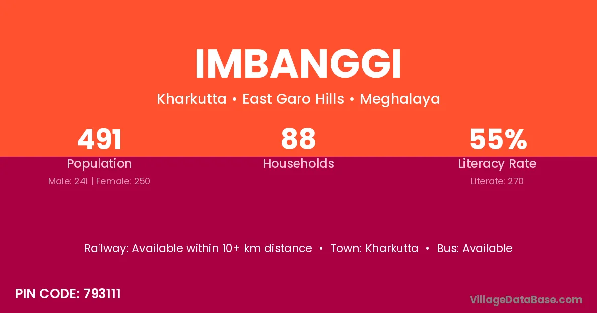 Imbanggi village has a total population of 491 people, of which 241 are males and 250 are females.