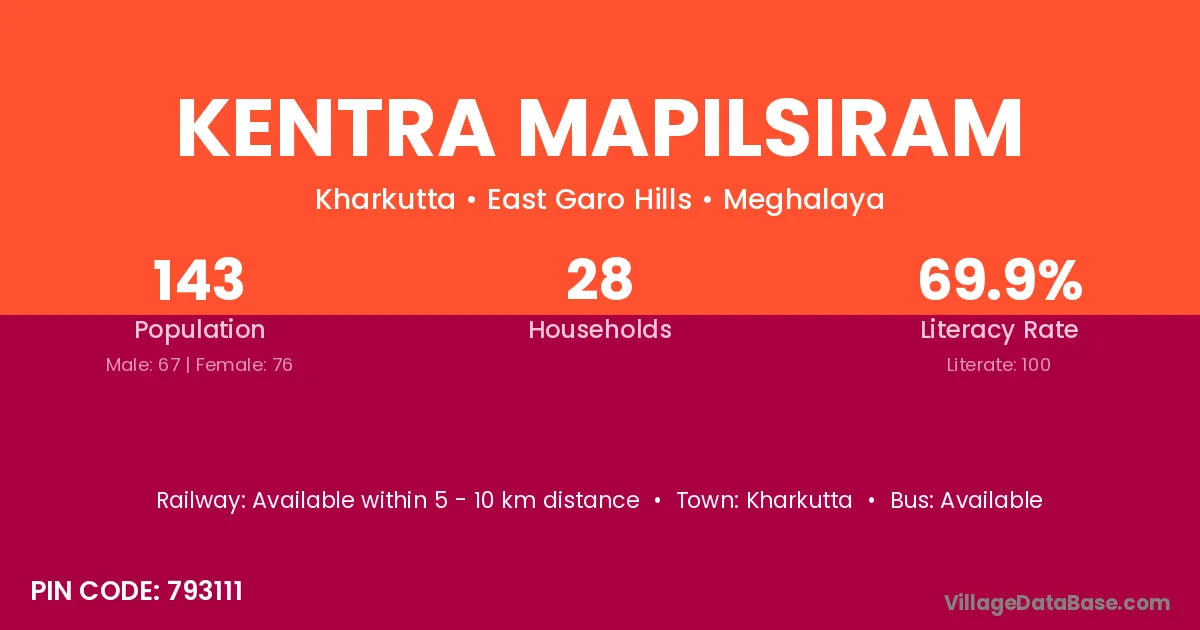 Kentra Mapilsiram village has a total population of 143 people, of which 67 are males and 76 are females.