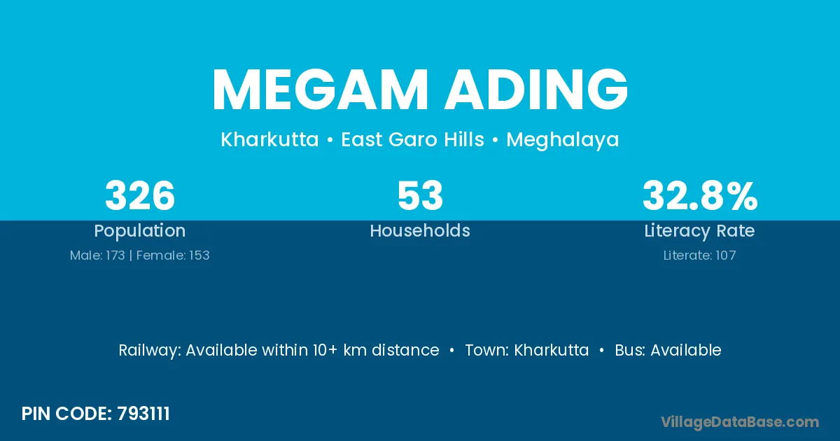 Megam Ading village has a total population of 326 people, of which 173 are males and 153 are females.