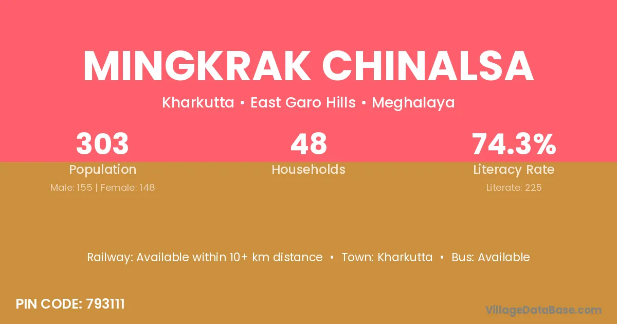 Mingkrak Chinalsa village has a total population of 303 people, of which 155 are males and 148 are females.