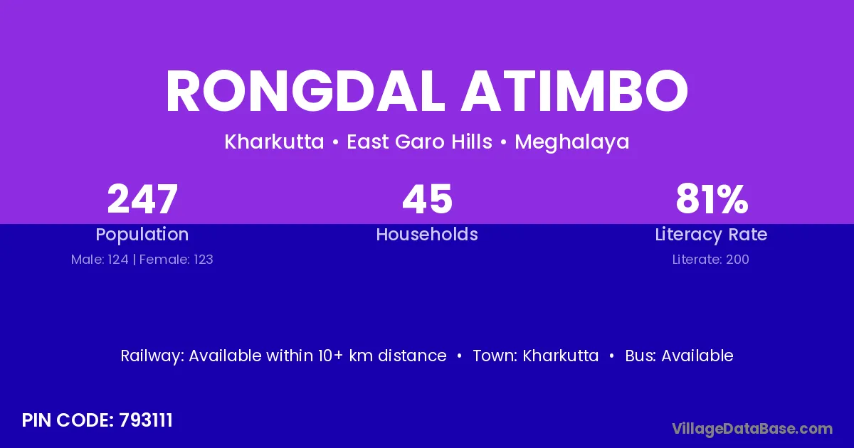 Rongdal Atimbo village has a total population of 247 people, of which 124 are males and 123 are females.