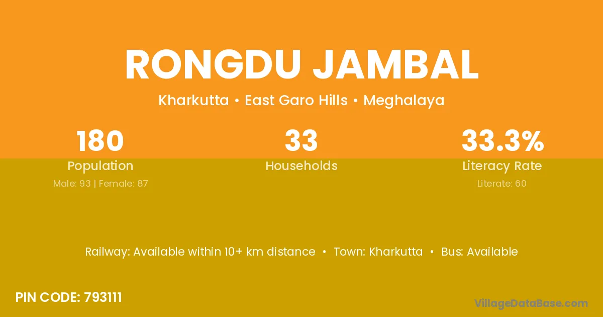 Rongdu Jambal village has a total population of 180 people, of which 93 are males and 87 are females.