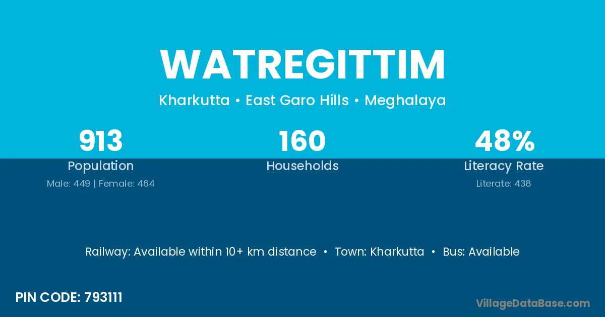 Watregittim village has a total population of 913 people, of which 449 are males and 464 are females.