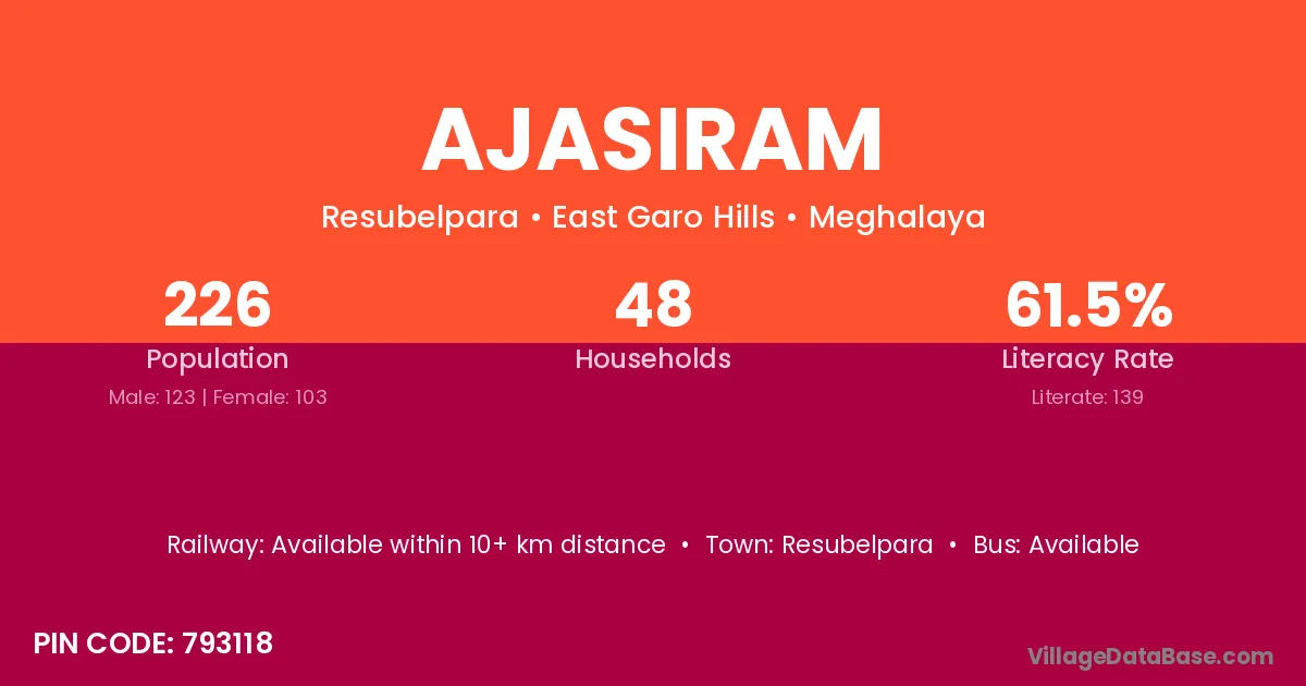 Ajasiram village has a total population of 226 people, of which 123 are males and 103 are females.