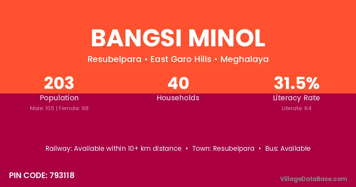 Bangsi Minol village has a total population of 203 people, of which 105 are males and 98 are females.