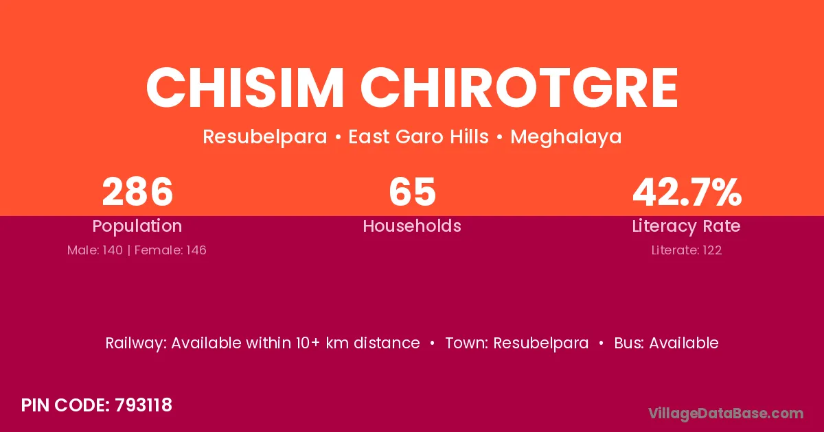 Chisim Chirotgre village has a total population of 286 people, of which 140 are males and 146 are females.