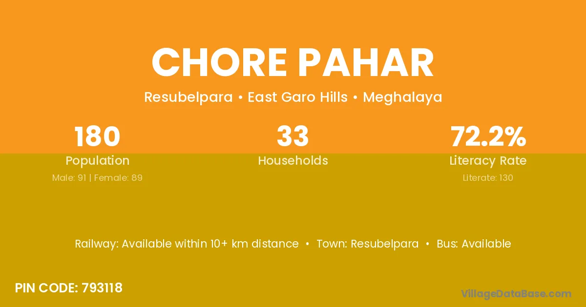 Resubelpara is the nearest town to Chore Pahar village for major economic activities