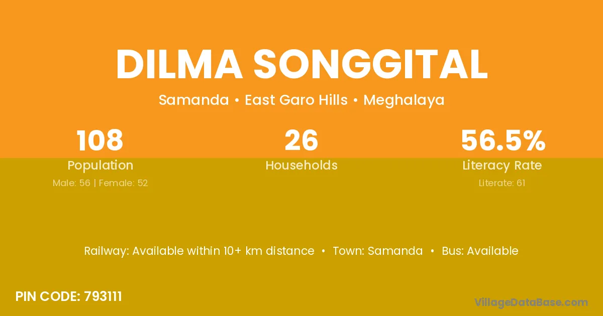 Dilma Songgital village has a total population of 203 people, of which 101 are males and 102 are females.