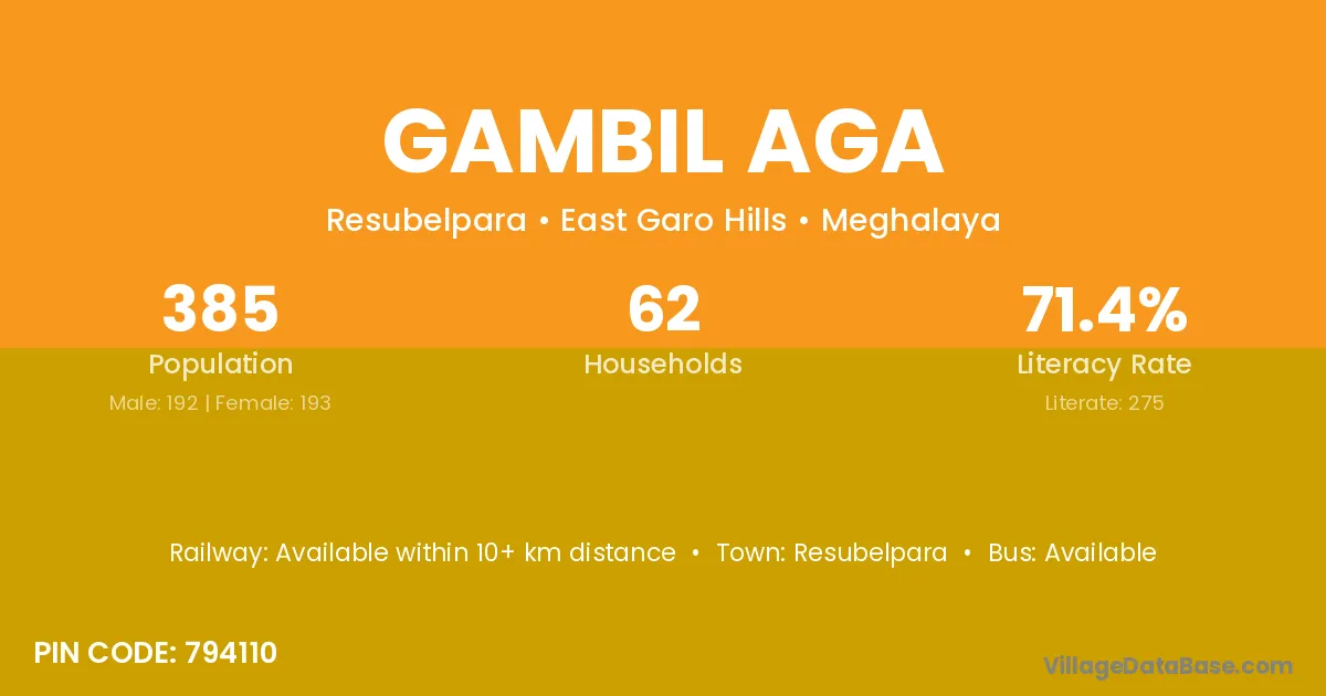 Gambil Aga village has a total population of 385 people, of which 192 are males and 193 are females.