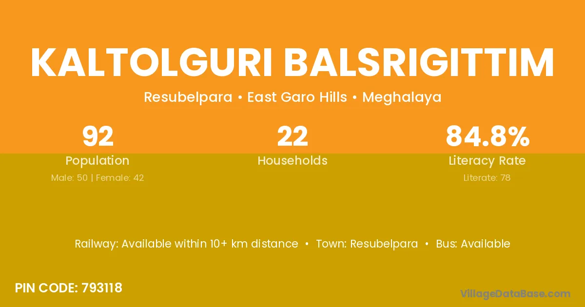 Kaltolguri Balsrigittim village has a total population of 92 people, of which 50 are males and 42 are females.