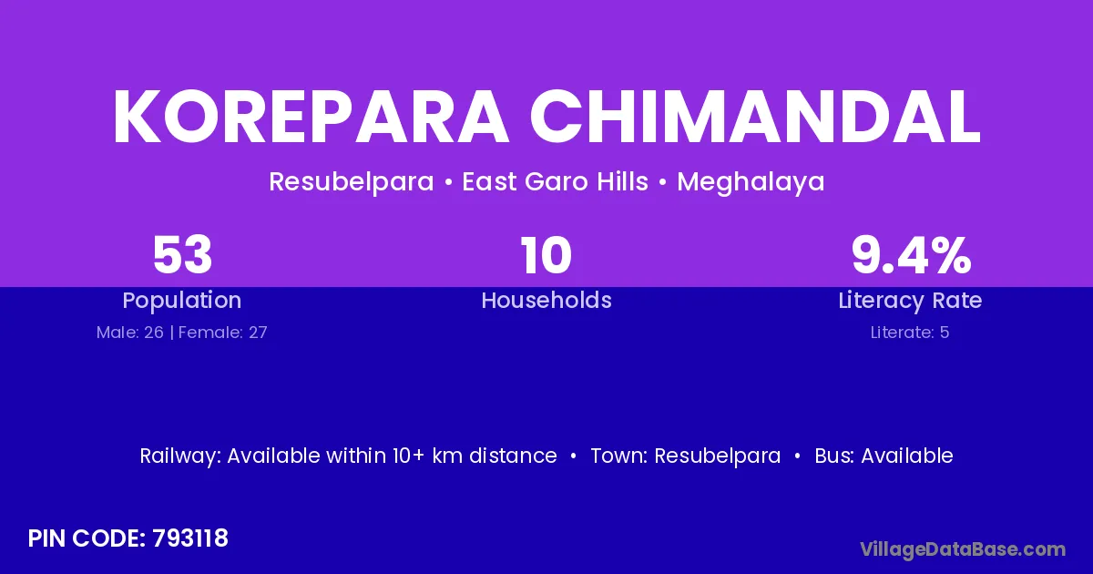 Korepara Chimandal village has a total population of 53 people, of which 26 are males and 27 are females.