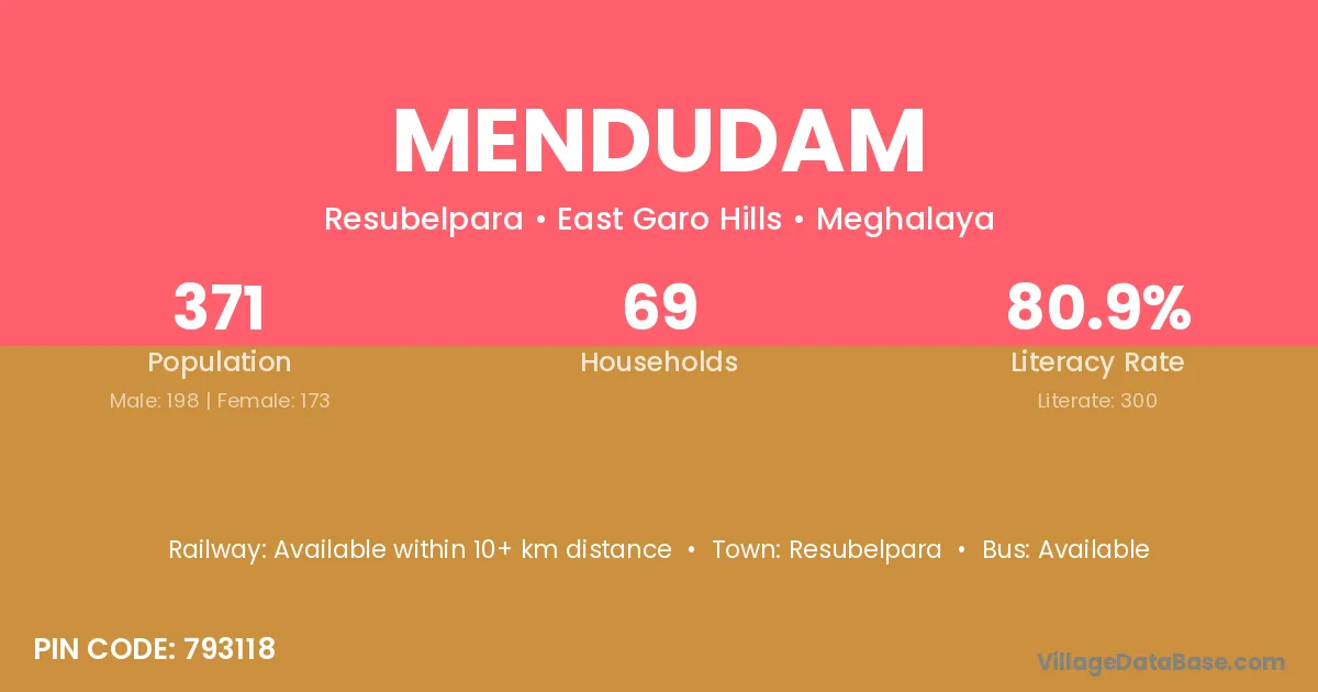 Mendudam village has a total population of 371 people, of which 198 are males and 173 are females.