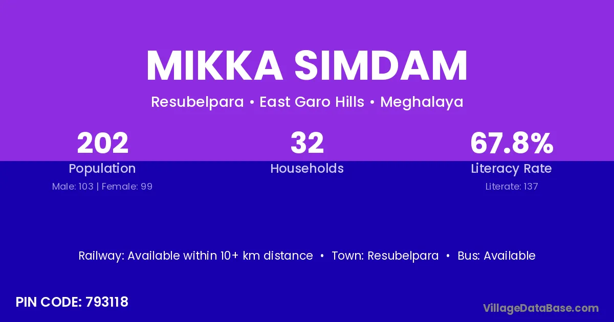 Mikka Simdam village has a total population of 202 people, of which 103 are males and 99 are females.